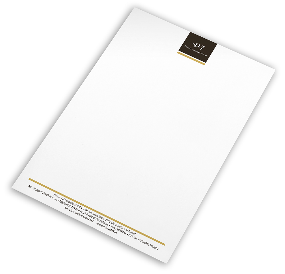 Een belangrijk onderdeel van de huisstijl is het briefpapier. Het is belangrijk dat het in de “lijn” van de huisstijl ligt om zo een eenheid in de uitstraling te bewerkstelligen. Naast het logo kunt u dan denken aan de bedrijfskleuren en andere relevante informatie. Voor Minus 417 is JMI Media aan de slag gegaan om prachtig briefpapier te realiseren. Door onze jarenlange ervaring in de grafiemedia branche hebben wij ontelbare contacten, ieder met hun eigen kwaliteiten, zodat wij het drukwerk tegen zeer scherpe prijzen kunnen leveren.